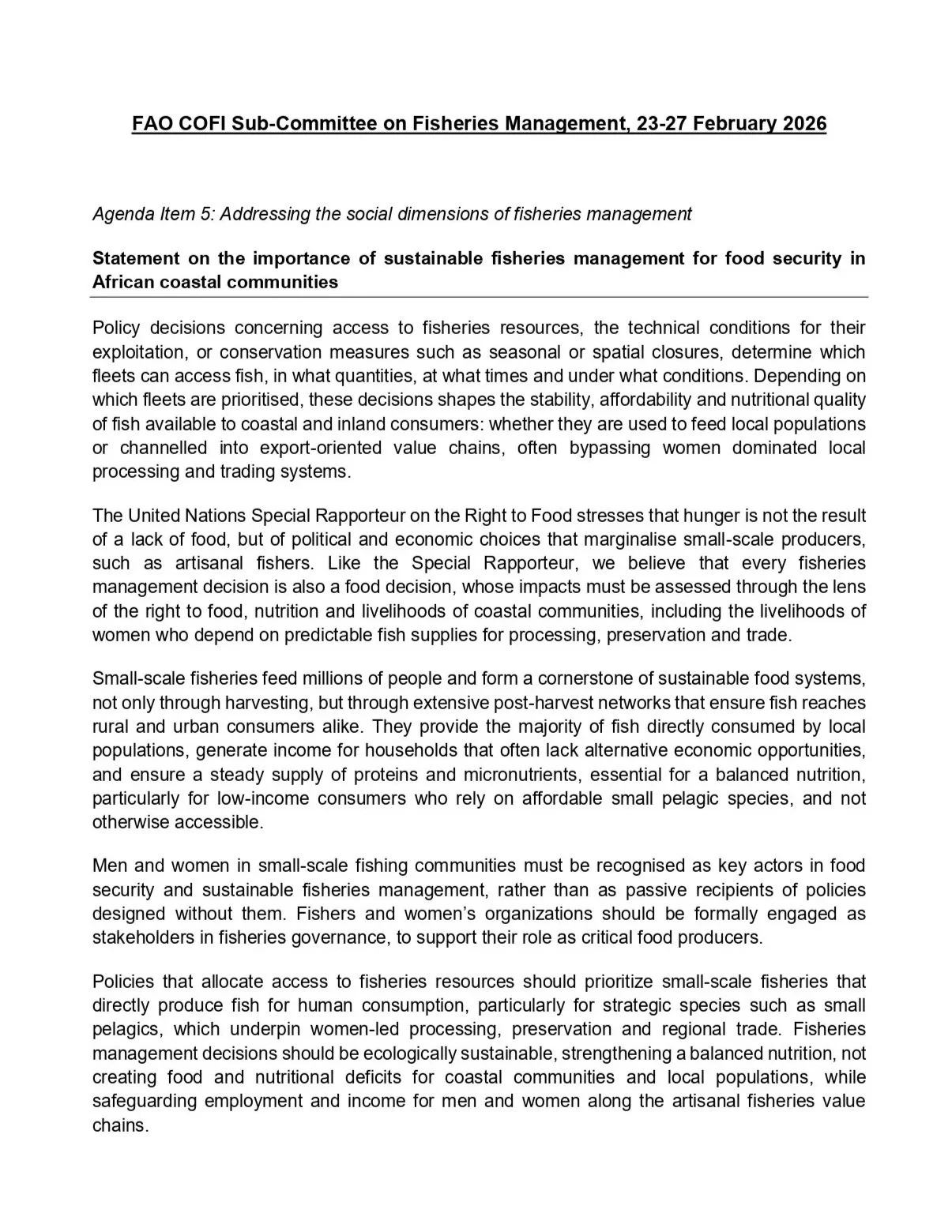 “Access arrangements should be conditional on precautionary and transparent assessments of fish stocks and should prioritise local food security and small-scale fisheries. Spatial and temporal provisions must protect artisanal fishing grounds, spawning areas and post-harvest spaces, reducing conflicts and safeguarding women’s livelihoods.” Photo: Mercy Mghanga at the Second session of the FAO Subcommittee on Fisheries Management, by Margaux Rochefort.