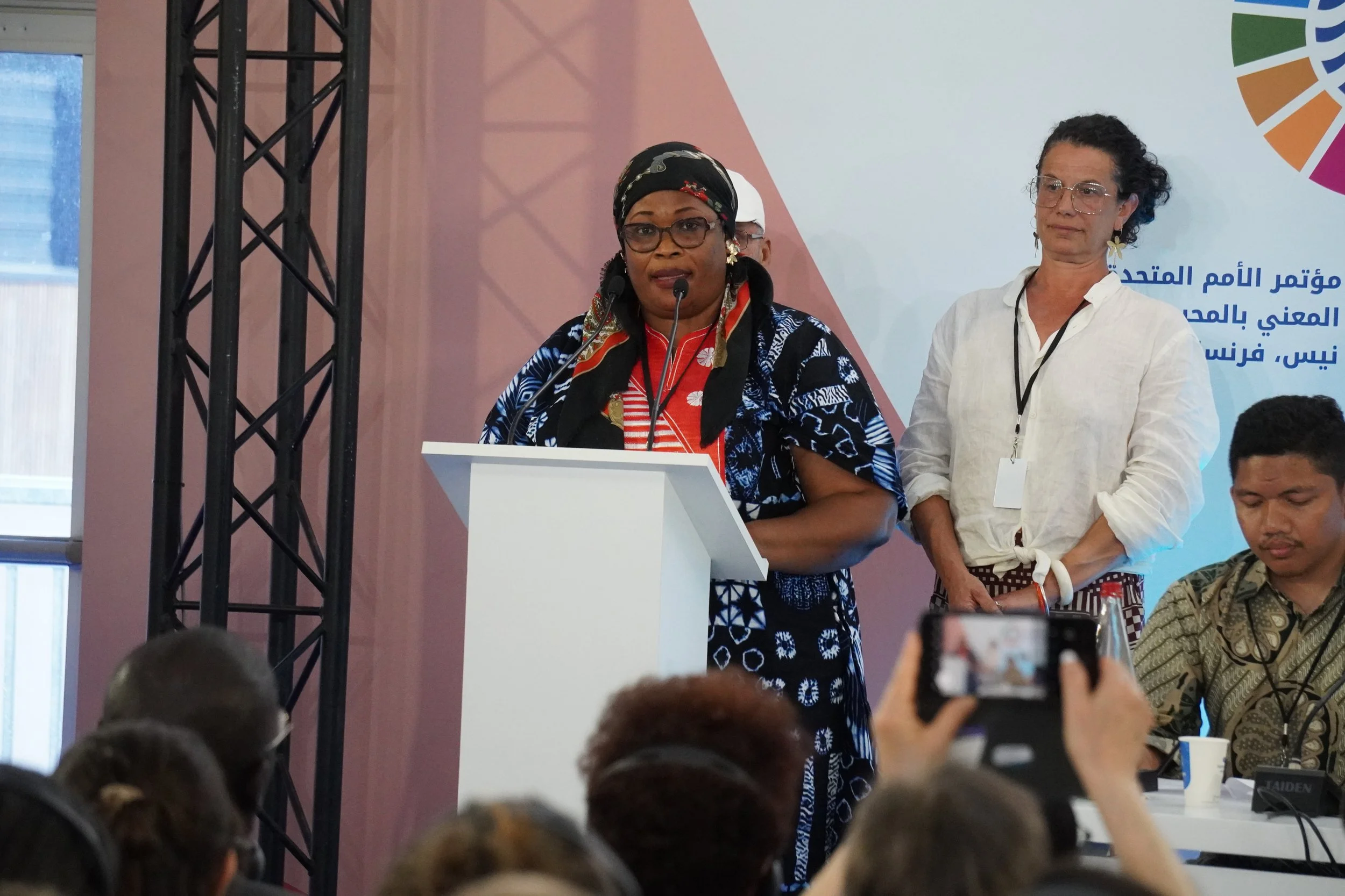 With the help of interpreters, small-scale fishing representatives were able to speak in their own languages. As most UNOC3 side events were held in English, this posed a barrier for non-English speakers. Interpretation remains a crucial tool for ensuring inclusive and equitable dialogue. Photo: Press conference of small-scale fisheries representatives at UNOC3, by Joëlle Philippe.